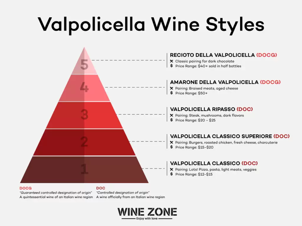 Rượu Valpolicella có 5 cấp độ, bao gồm các phong cách như Valpolicella Ripasso, mang lại giá trị tốt hơn là Amarone.